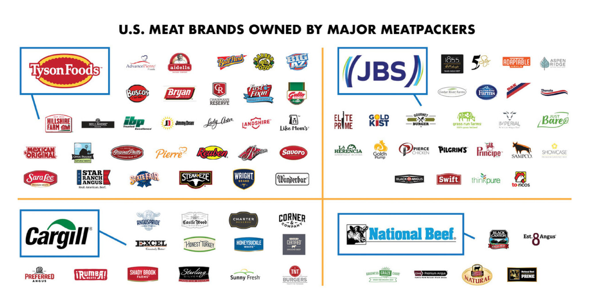 Meatpacking is one of the most consolidated industries in our food system. Of the more than 70 meat brands marketing to consumers and retailers under the guise of individual names and logos, just four corporations—Tyson, JBS, Cargill, and National Beef—are behind these brands.